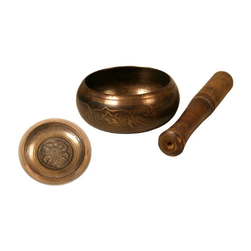 Singing Bowl, Decorated, with 3 3/4 inch opening. Highly decorated spun bronze. Includes wooden beater. Cushion Sold seperately. They sometimes feature religious iconography; motifs and symbols, such as the Tibetan mantra Om mani padme hum, images of Buddhas, or the Ashtamangala (Eight Auspicious Signs). The bowls are made of Panchaloga: literally translated from Sanskrit as Five Metals. The metal alloys contain copper, tin, zinc, iron and other metals